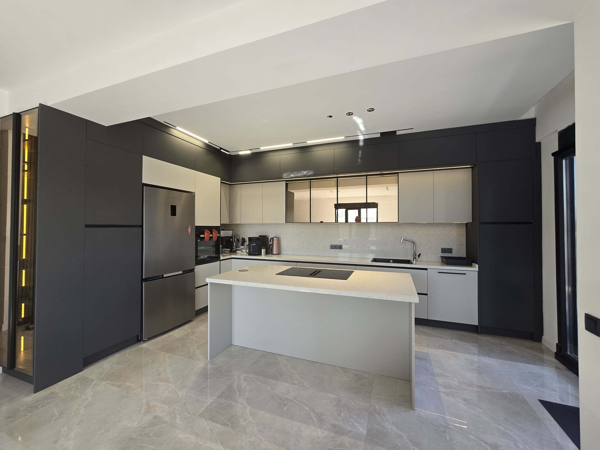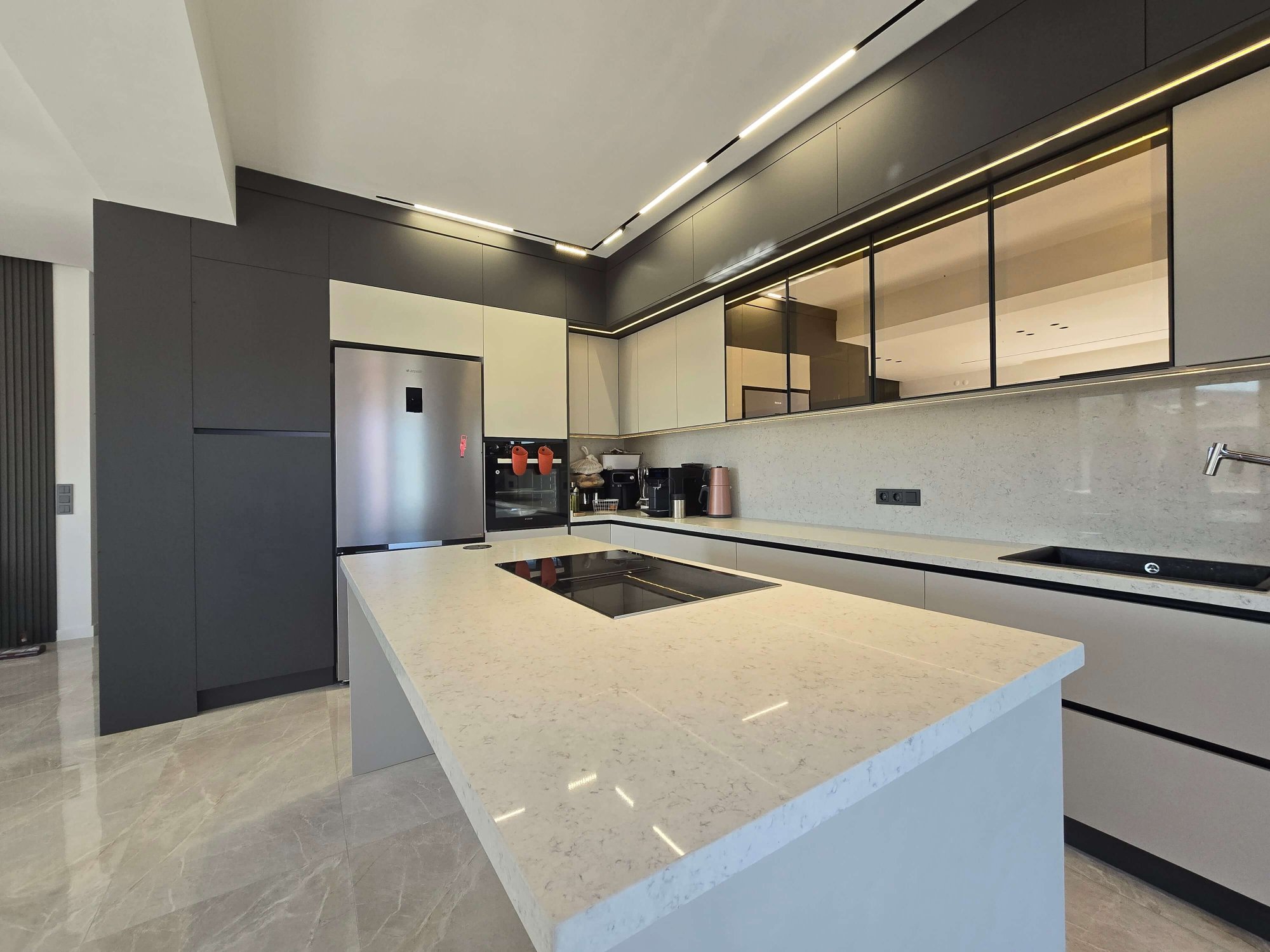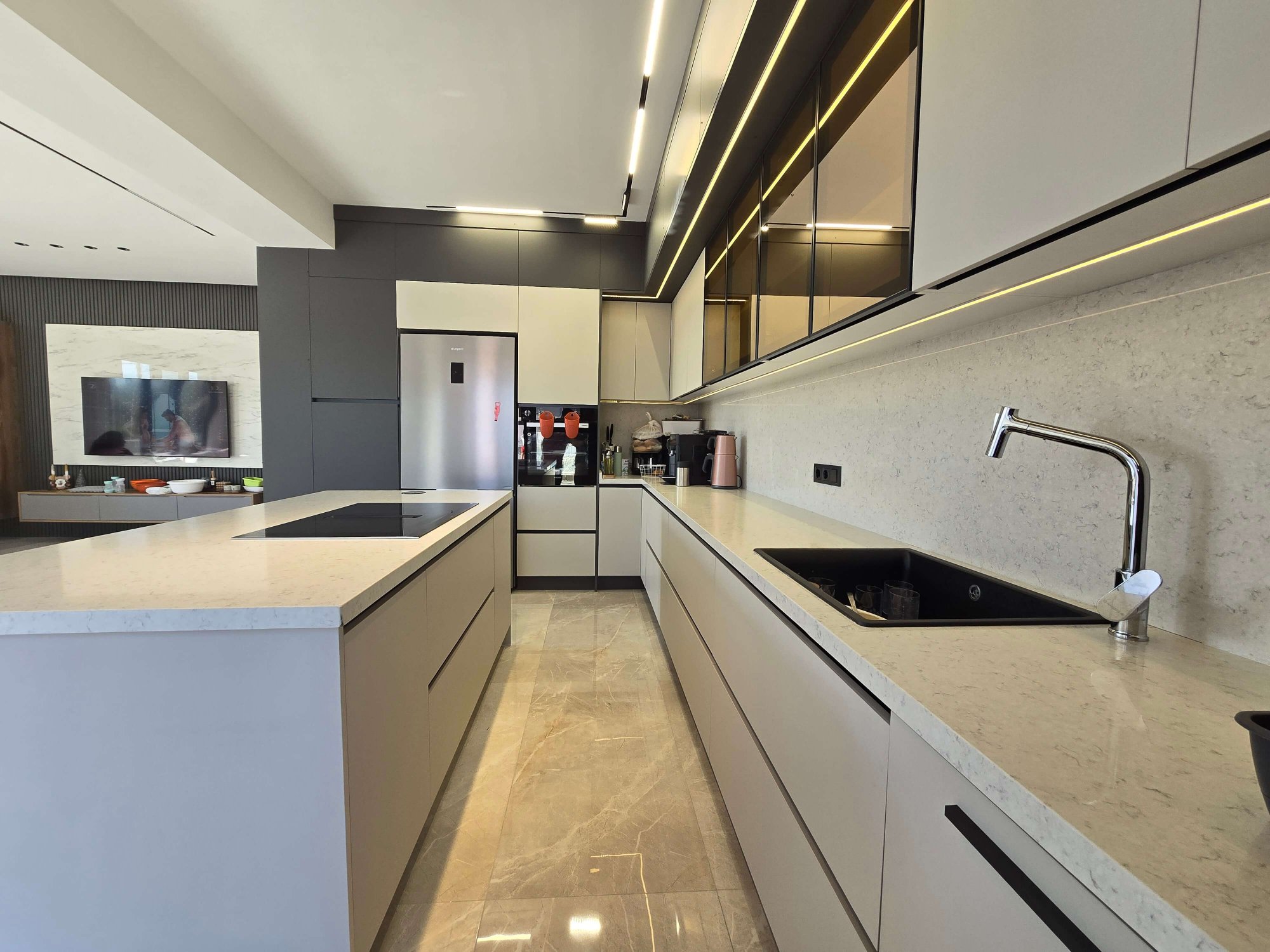 Grinin açık tonu ve antrasit uygulamalı,tezgah arkasında kuvars panel kullanılarak tasarlanan dolap içlerinde led aydınlatma kullanılan keyifli projelerimizden.