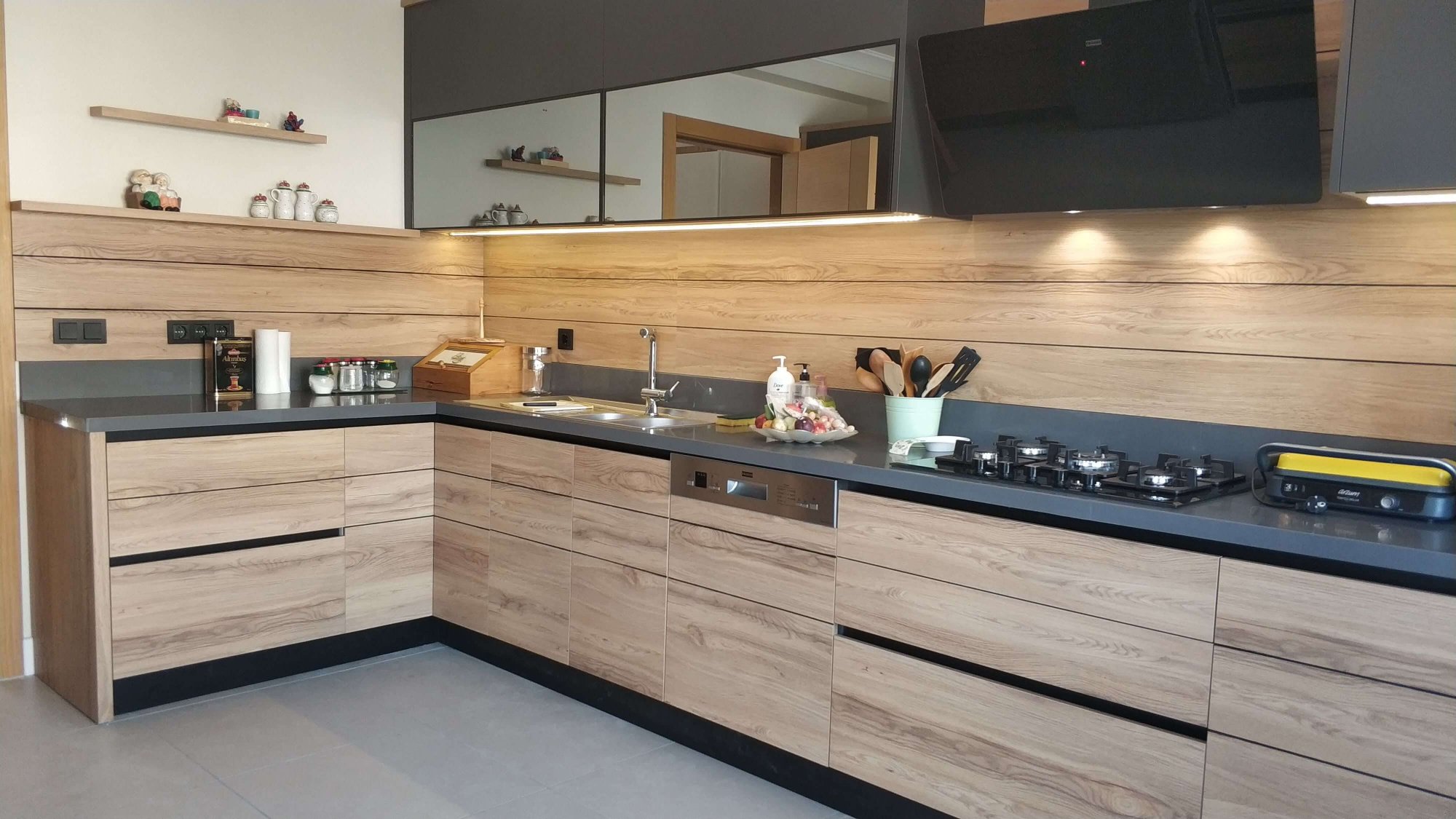 Antrasit ve ahşabın kullanıldığı kişiye özel kendinden kulplu, çizilmelere dayanıklı kuvars tezgahlı farklı tasarım örneklerinden.